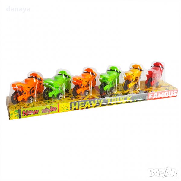 Комплект от 6 броя цветни състезателни мотори за момчета, които обичат да си играят с превозни средства. Играчките са пластмасови. Подходящи са за подарък.