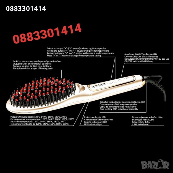 Турмалинова керамична технология четка за изправяне на коса за лъскава, гладка и сияйна коса. Тя има слой загряти зъби, температурен регулатор от 120ºC до 200º C (в диапазона от 20ºC), LED индикаторна лампа, 360º въртящ се захранващ кабел, 1,8 м и превключвател за включване / изключване с LED лампа. Предлага ефективно изправяне на средна дължина и дълга коса. Меките влакна се плъзгат в косата, докато ергономичният му дизайн не уморява ръцете.