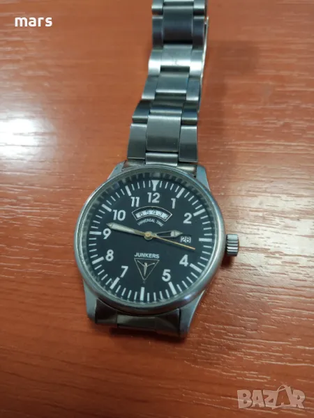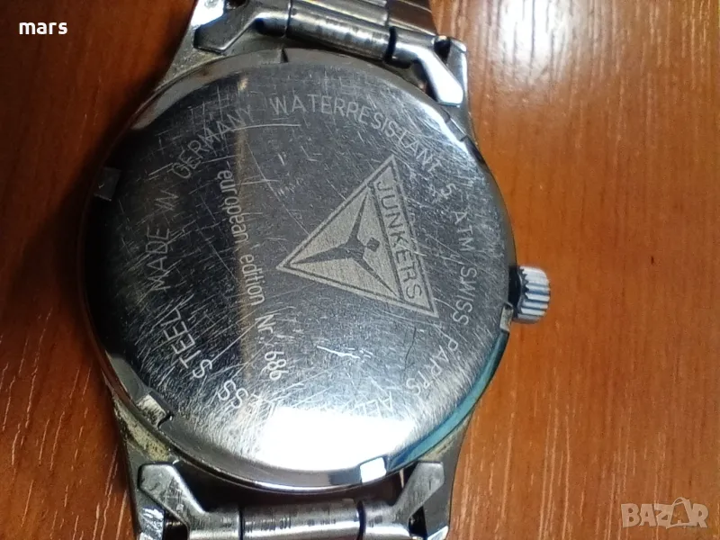 Кварцов часовник, произведен в Германия от "Junkers", швейцарска машина с две времена /второто на 12ч./,стоманена каса-37мм. без коронката и 40мм. с нея, 18мм. м/у лъговете, 5 бара водоустойчивост, заден капак на винт.