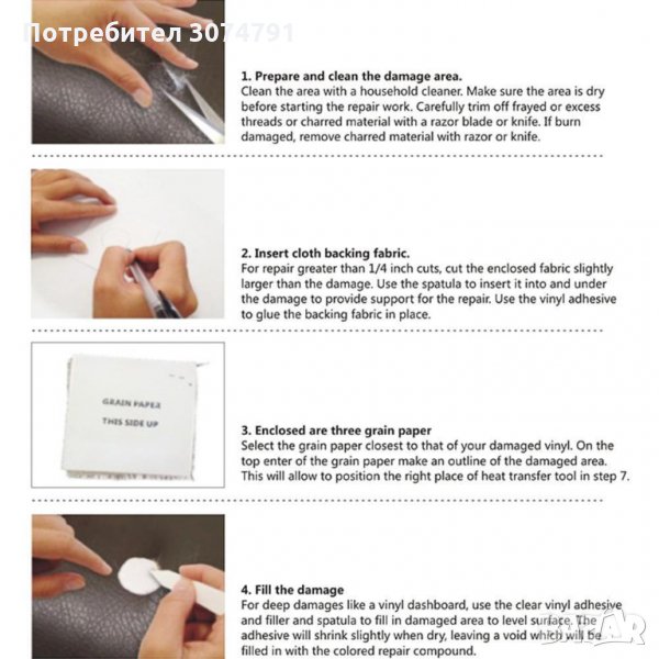 1. Преди да използвате продукта, се препоръчва първо да опитате върху зона, която не се забелязва толкова, като например гърба на дивана или върху предоставената проба.