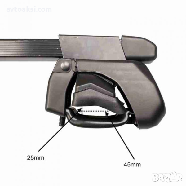 1. Захващането на напречните греди за фабричния рейлинг на покрива на автомобила. Подходящ за всички автомобили с фабрично надлъжни рейлинги на покрива, стандартни (на разстояние от покрива) на автомобила. За релси с ширина до 45мм и дълбочина 25мм.