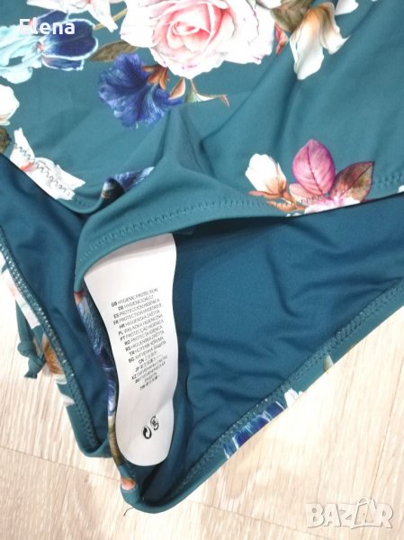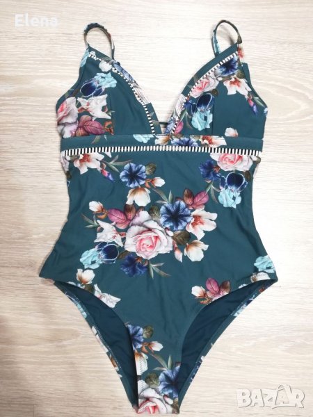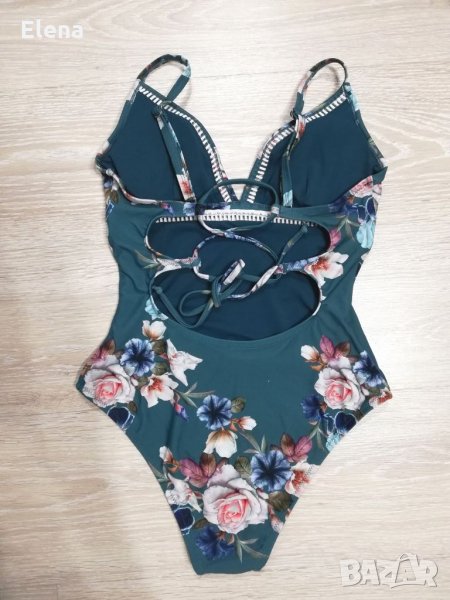 Зелен цял бански костюм на цветя с остро деколте и връзки на гърба. С чашки със свалящи се подплънки, които придават форма на бюста. Налични размери: S