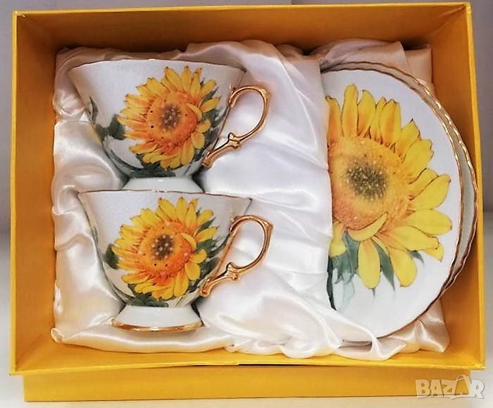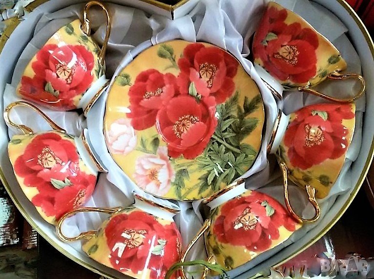 Шест броя чаши с чинийки в кутия за подарък : 360 лв.