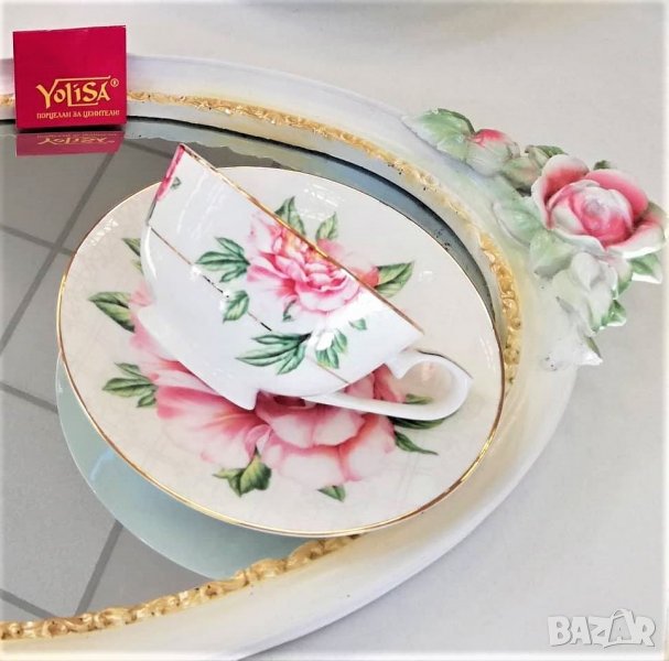 Комплект чаша и чинийка от висококачествен костен порцелан с богата ръчна декорация и злато, подходяща за ежедневна употреба или празничен подарък за дама , мъж или семейство.