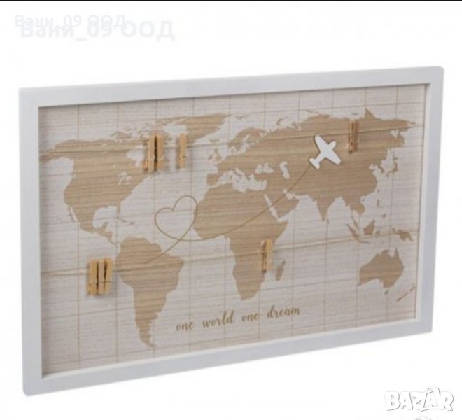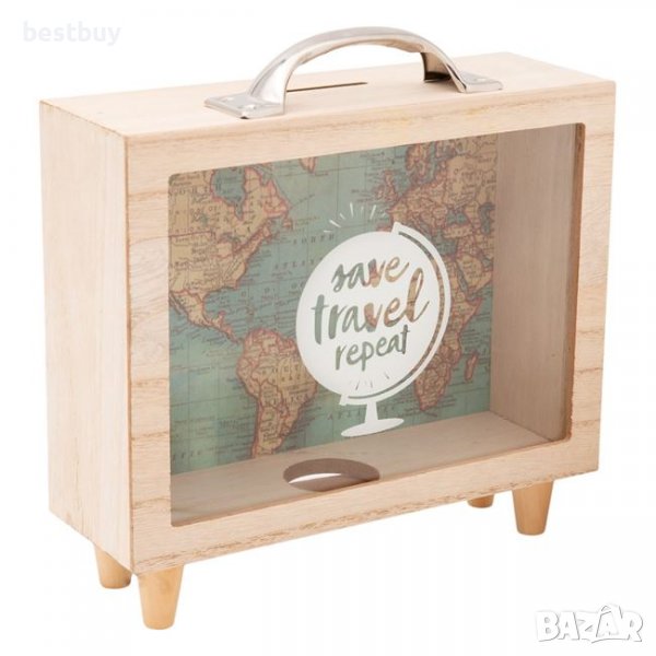 Събирайте своите средства за следвото пътуване в симпатичната касичка-куфарче с надпис "Save travel repeat", a след това окачете снимките от пътуването на миниатюрните щипчици на паното, редом до малкото дървено самолетче!