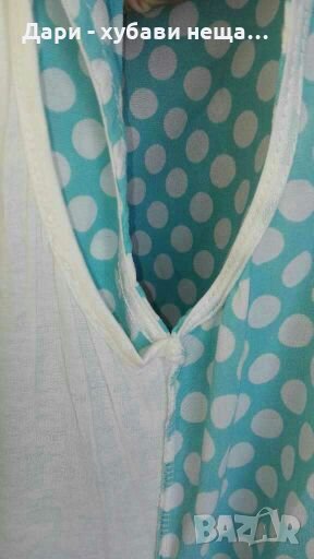 Нова, с етикет - подходяща и за подарък.Горната част е небесно синя, на бели точки.Позволява различни размери ГО, заради деколтето - тип „прегърни ме”, както и вградения потник, който е силно еластичен.Роклята е с ниска талия и колан, който се нанизва на две гайки.