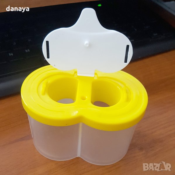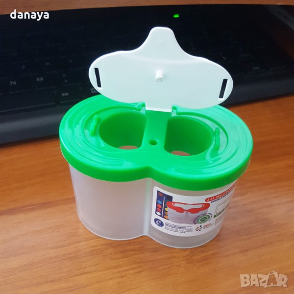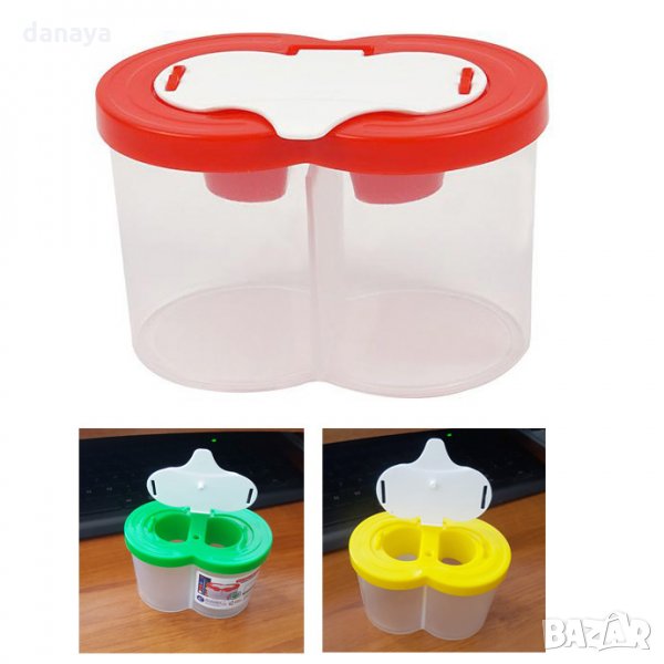 Неразливаема двойна чашка за рисуване. Чашката има две отделни отделения за още по-прецизно изплакване на четката за рисуване. Капаче, което не позволява разливане на водата. Малък и компактен размер, незаемаща място и е удобна за съхранение в ученическата раница. Предлага се в различни цветове.