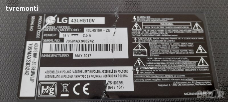 MAIN BOARD ,EAX66826106(1.0),борда е дефектен само с лого LG Демонтиран от Телевизор LG 43LH510V със счупен дисплей HC430DUN-SLVX1-A11X тесвана от нашия техник