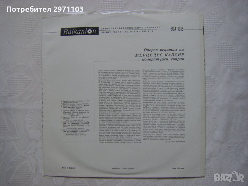 Грамофонна плоча - ВОА 1015 - Оперен рецитал на Мерцедес Капсир - колоратурен сопран