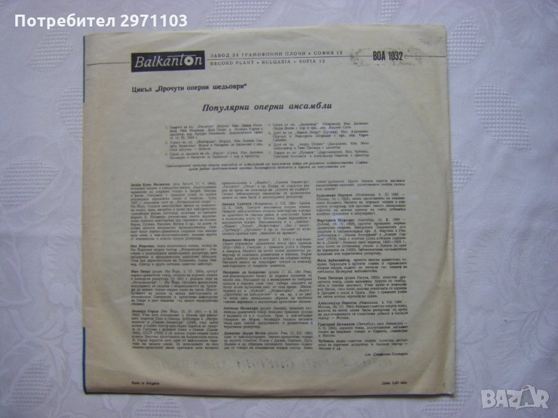 Грамофонна плоча - ВОА 1032 - Цикъл Прочути оперни шедьоври - Популярни оперни ансамбли