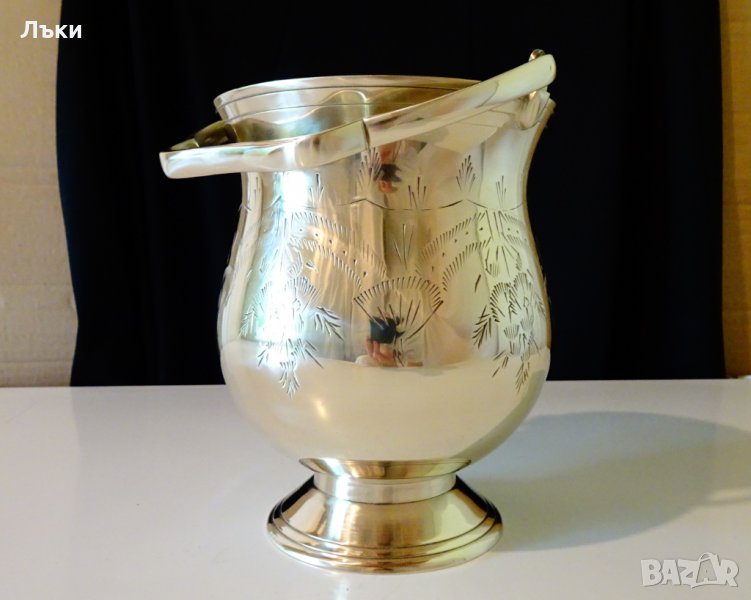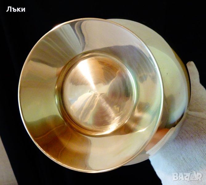 със златен блясък и камбанен звън. Съда е релефно гравиран с разкошни барокови орнаменти.Височина с дръжката 25 см.,височина на съда 15.5 см.,диаметър 13 см.,тегло 680 гр.Вместимост 1.2 л.