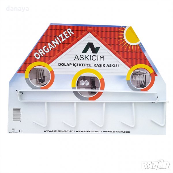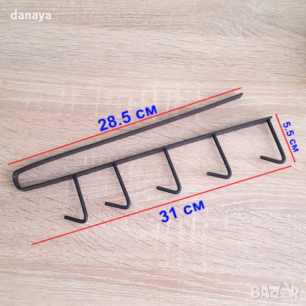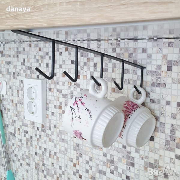 Метална стойка, закачаща се за рафт. Поставка за чаши с дръжка или кухненски прибори. Мултифункционална – използвайте я като органайзер за чаши за кафе или чай, органайзер за кухненски прибори, органайзер за вратовръзки в гардероба, или като органайзер за колани, шалове и други. Закачалката има 5 куки за закачане и се предлага в два цвята – бял и черен.