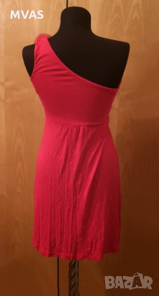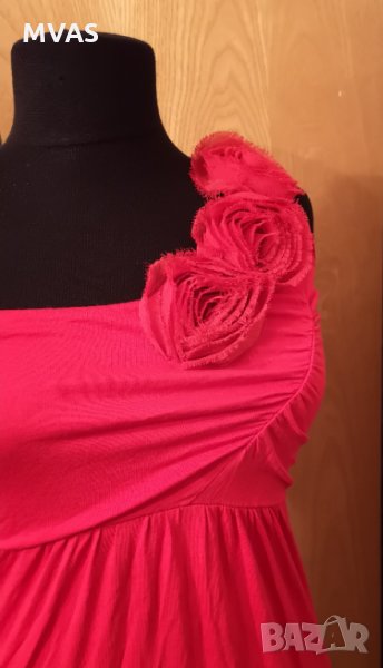Червена рокля с рози на едно рамо.