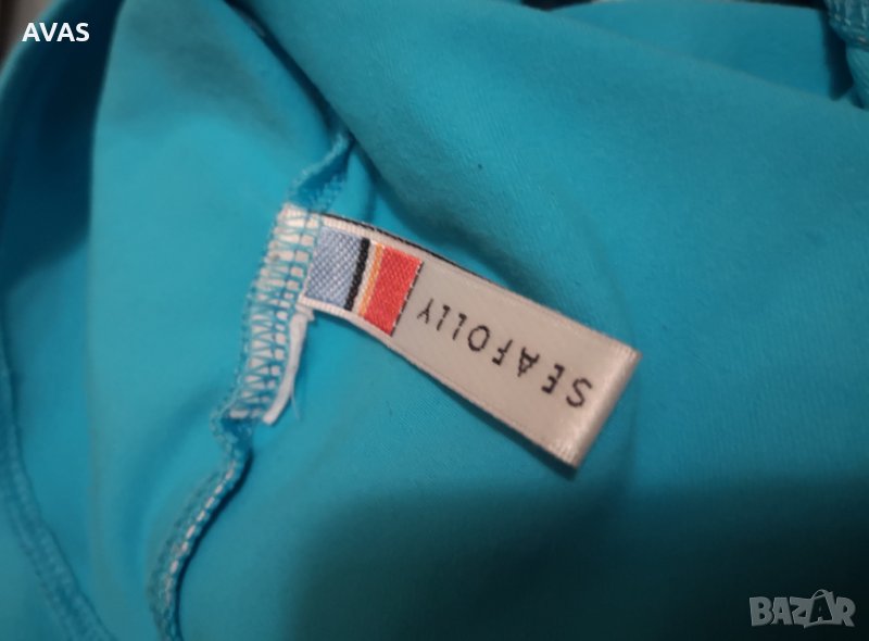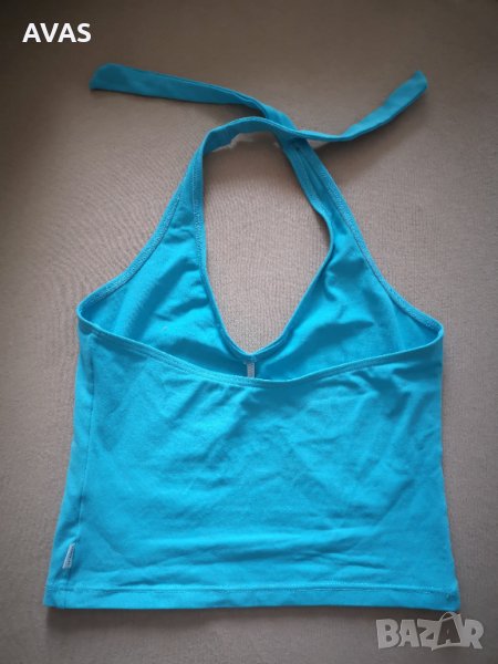 Светло син къс кроп топ с връзки на гърба. Еластичен плътен, не прозира. Може да се носи и върху бански.