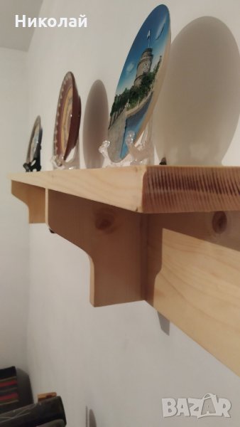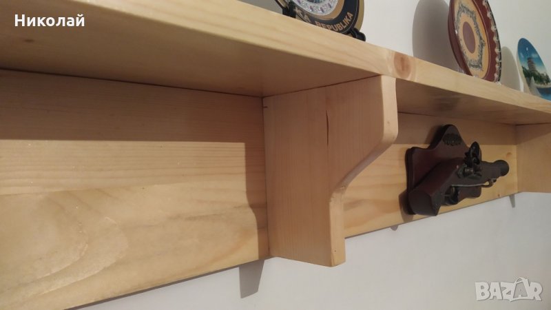Полица за битова стая / рафт за битова стая . Полицата е изработена от иглолистна дървесина, ипрегнирана е против дървояди и лакирана с безцветен лак. Подходяща е за декорация на