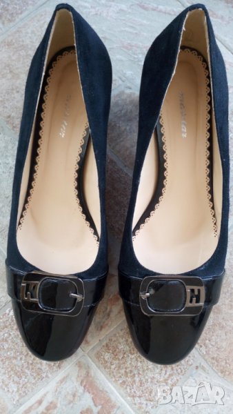 Официални дамски черни обувки с ток. Обувките са велурени с лачена