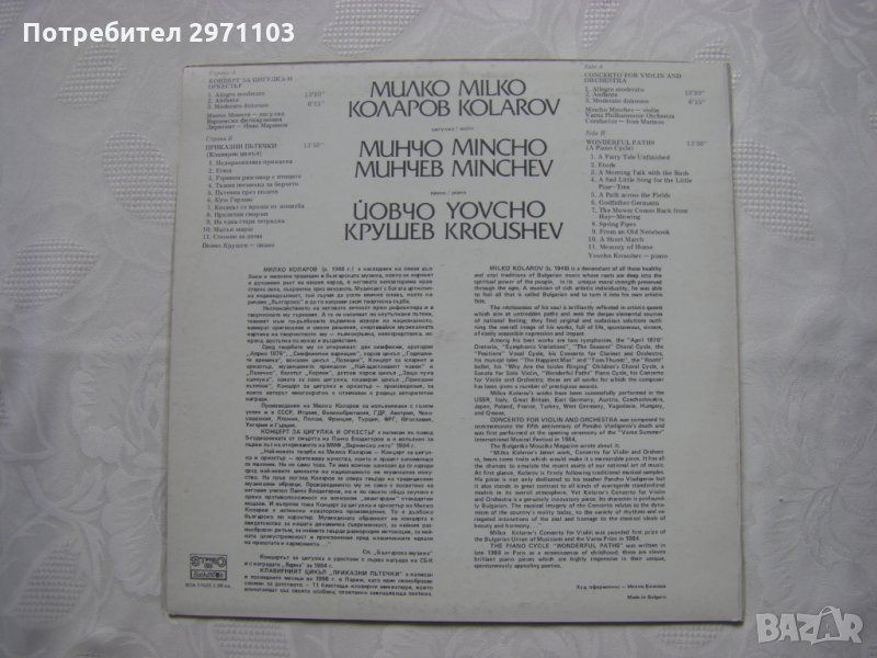 In the 1st work: Mincho Minchev, violin, Varna Philharmonic Orchestra, Ivan Marinov, conductor. In the 2nd work: Yovcho Krushev, piano