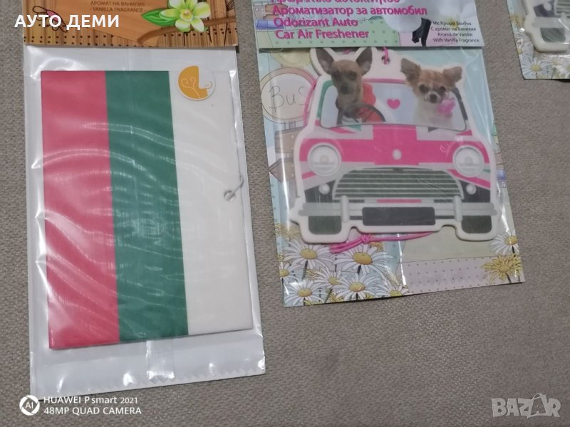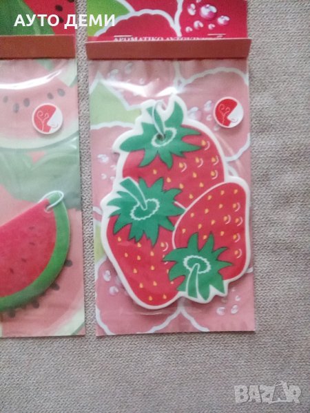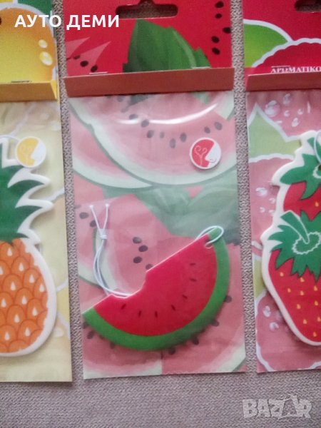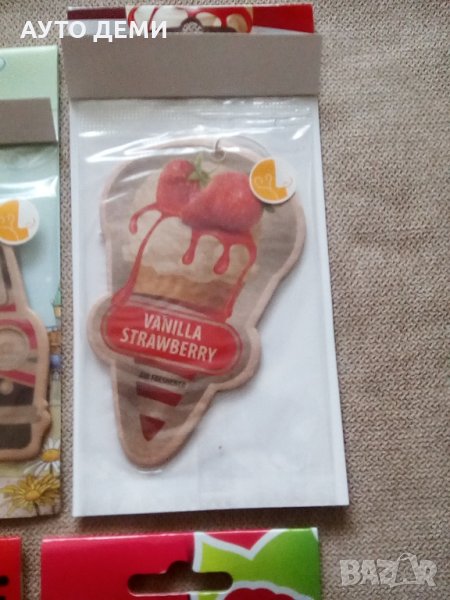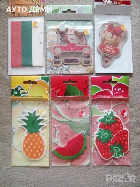 Продавам шест модела висящи ароматизатори с аромат на ванилия или плодове с формата и цветовете на българския трибагреник ( знаме ) ,кола с кученца , сладолед , ананас , диня и ягода