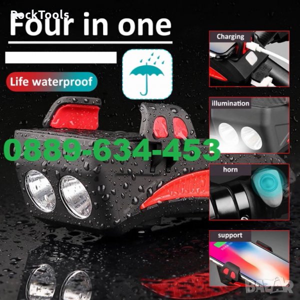 Уникална стойка за телефон на велосипед, скутер, електричека тротинетка, мотор, колело и др. с мощен LED фенер, клаксон и поставка за телефон + POWERBANK.