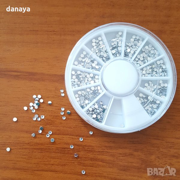 Камъчета за маникюр. Декорация за нокти. Закрепят се с гел, лепило или акрил. Камъчетата се предлагат в удобна кръгла кутия за съхранение. Имитация на камъчета Сваровски.
