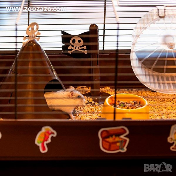 Включени аксесоари: 1 ясла, 1 бутилка за пиене, 1 къща за гнезда и 1 колело, 1 декорация със знаме