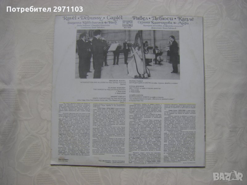 Интродукция и алегро: за арфа, струнни, флейта и кларинет / М. Равел. 2 танца: за арфа и струнен оркестър / Кл. Дебюси. Фантастична новела: по необикновената история Маската на червената смърт на Е. А. По: за арфа и струнни / А. Капле