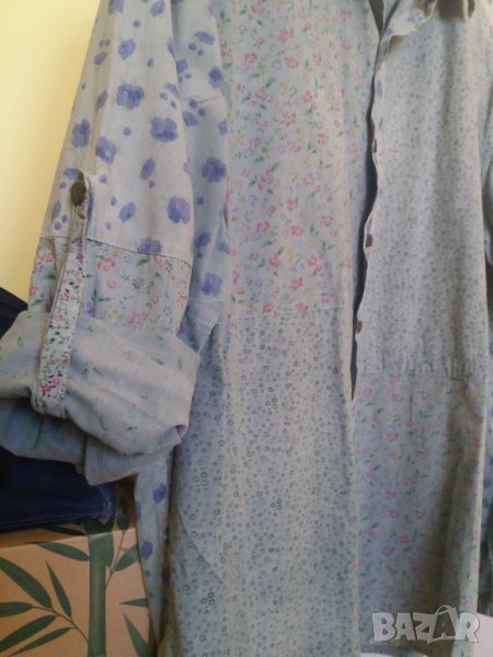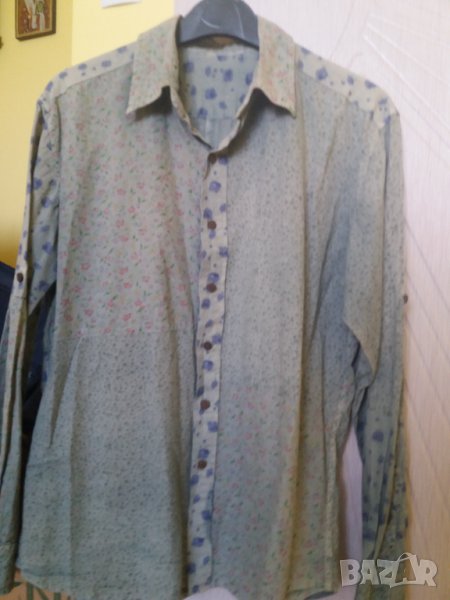 Мъжка спортна риза с дълъг навиващ се ръкав с копче за лятото, много тънка памучна материя, сивозеленикав цвят с много интересни шарки на различни парчета. Размер L-XL , гръдна 60 см /или обиколка 120 см, рамене 48 см, дължина 66 см, ръкав 62 см. Отговарям на съобщения тук, изпращам с куриер или лично предаване в София.