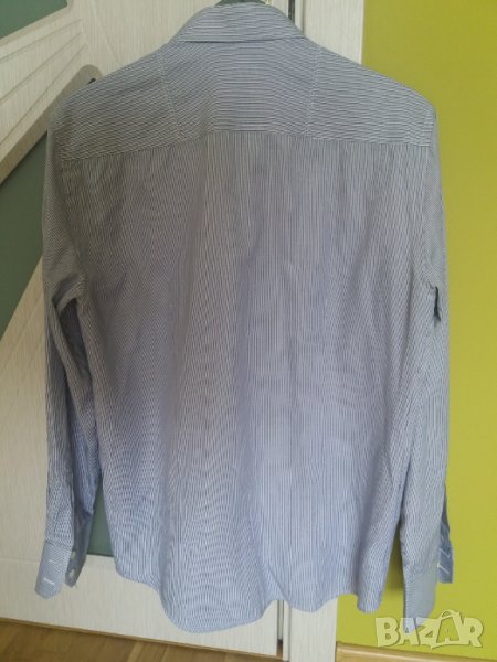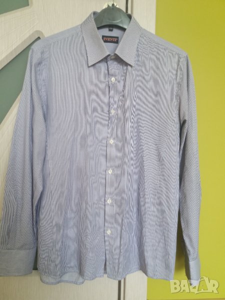 Мъжка риза дълъг ръкав вталена Iventi размер L 41-42,материя 55 % памук и 45 % полиестер. Светлосиня на тънки по тъмни райета. Отговарям на съобщения тук, изпращам с куриер или лично предаване в София.