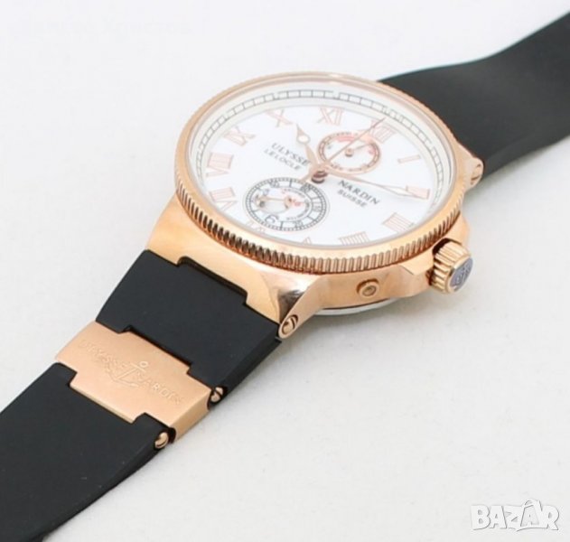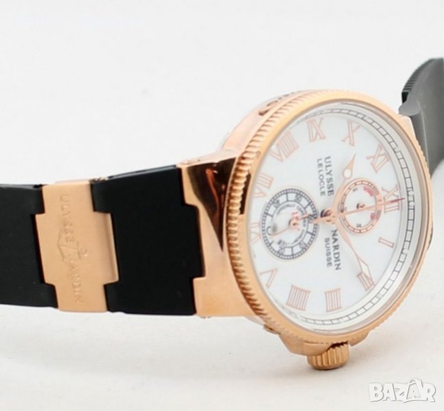 Ulysse Nardin Lelocle, кварц, хронограф, полиран стоманен корпус розово злато, релефен бял циферблат с дата в позиция 6 часа, фосфоресциращи стрелки, римски цифри и черна каучукова каишка с оригинално закопчаване.Луксозна кутия.