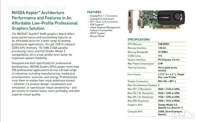 Видеокарта Nvidia Quadro K600, снимка 1 - Видеокарти - 33037959 Видеокарта Nvidia Quadro K600, снимка 2 - Видеокарти - 33037959 Видеокарта Nvidia Quadro K600, снимка 3 - Видеокарти - 33037959 1/3