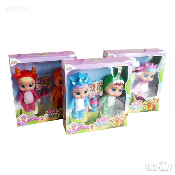 Комплект от 2 броя плачещи кукли със звук в различни бебешки дрехи. Куклите имат шишенце за вода или мляко. Истинско забавление за малките момичета, които обичат да си играят на майки с деца. Куклата има говорител на гърба си, който при натискане издава звуци – мама-мама; тата-тата, смях, плач. Ръцете и краката се движат механично. Бебето може да се сложи легнало или седнало.