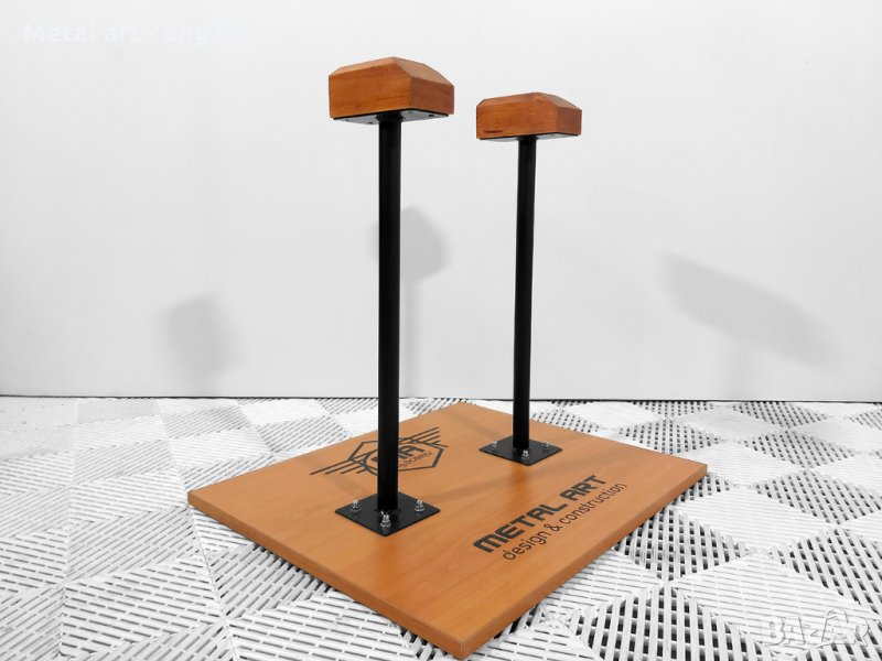 Нашата Гимнастическа стойка (Hand Balance Board) е акробатичен уред за баланс на ръце, който Ви дава възможност за пълноценна тренировка. Тя е подходящо допълнение към оборудването във Вашата спортна зала или домашен фитнес. С Гимнастическата стойка също така може да изпълнявате различни гимнастически упражнения – CrossFit, Calisthenics, Street Fitness. Ръкохватките са с ергономична форма и са изработени от масивно дърво. Основата е от ПДЧ с дебелина 18 мм, снабдена с противоплъзгащи участъци за максимално удобство и безопасност по време на тренировка. Вертикалните стоманени тръби за изработени от стоманен профил с диаметър 27 мм. - прахово боядисани.