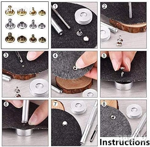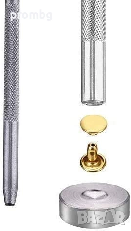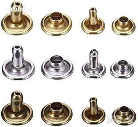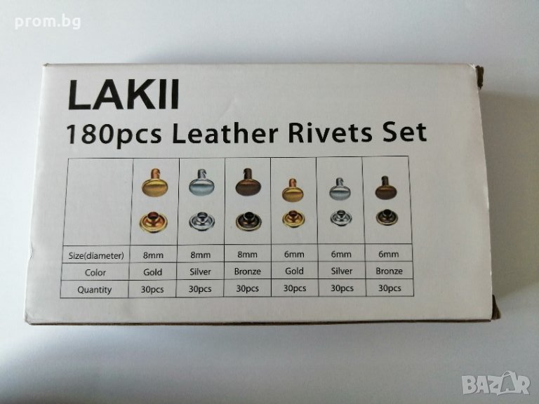 комплект 180 бр. рапиди и инструменти за монтаж, нови. В 3 цвята - сребристо, златисто и бронз. Първи размер - голям: 30 бр. от всеки цвят: диаметър на стебло 3 мм; диаметър на шапка 8 мм. Подходящи за материал с дебелина до 4 мм. Втори размер - малък: 30 бр. от всеки цвят: диаметър на стебло 2 мм; диаметър на шапка 6 мм. Подходящи за материал с дебелина до 3 мм. Инструментите за монтаж са: замба за отвори с диаметър 3 мм, наковалня за двата размера рапиди и универсален дорник.