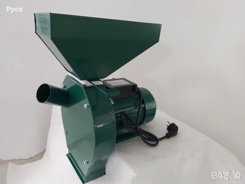 Електрическа фуражомелка 2 в 1. 2.5 kw пикова мощност, 3000 обороти/мин. С помощта на тази мелница можете да накълцвате както плодове, така и да мелете зърна в зависимост от монтираното ситото (ренде за плодове или главина с чукове).