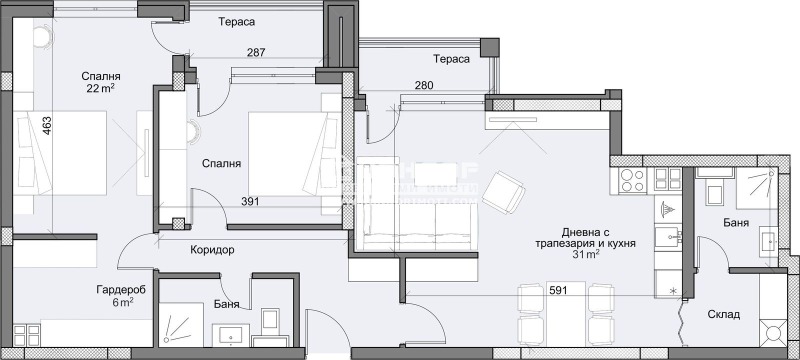 Оферта 55472: ГОТОВА СГРАДА! Предлагаме Ви възможността да закупите просторен 3-стаен апартамент в луксозна жилищна сграда с с модерна визия, проектиран да създаде максимален комфорт на живущите в него. Основната концепция e премиум строителство, отличаващо се със съвременен архитектурен дизайн и европейска визия. Едно от основните му предимства е страхотната локация, разположен на пешеходна близост до Централна градска част, съчетаващо лукс, спокойствие и комфорт. Жилището се състои от просторна южна дневна с трапезария и кухненски бокс - 31кв.м., с излаз на тераса, родителска спалня с обособена гардеробна - 28 кв.м., втора спалня - 12 кв.м., тераса - обща за двете спални, две бани с тоалетни, перално помещение и входно антре. Основната концепция при проектирането е да се постигнат просторни и функционални стаи с цел да се създаде максимален уют на модерното семейство. Изключителна съвременна архитектура и модерна технология на строителство. Визията е иновативна, привличаща внимание с уникалността си. Безопасна и сигурна среда за пребиваващите допълват комфорта на сградата. Всяко жилище разполага с пълно окабеляване за домофон, интернет и кабелна телевизия, общите части са луксозно завършени, а апартаментите са с алуминиева дограма с троен стъклопакет от най-висок клас, както и масивна блиндирана входна врата. За удобство на живущите съществува възможността да закупят подземни паркоместа. Възможност за закупуване чрез Банков Кредит на изключително изгодни условия за клиенти на агенцията !!!