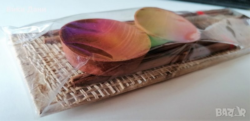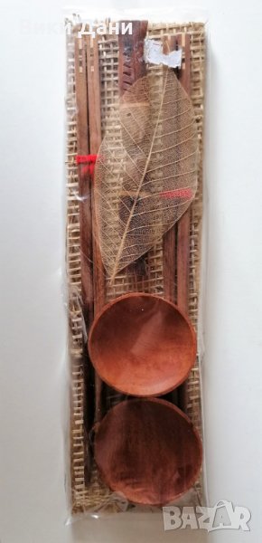 Япония Нов комплект за двама за хранене ритуален 4 клечки с мозайка от различни дървета 2 поставки форма рибки 2 панички махагон и скелет на лист за украса. подложката е естествено пресовани влакна с преплетка.