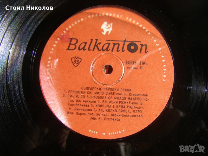 Грамофонна плоча - ВНН 196 - Български народни песни. Изп. Държ. анс. за народни песни - Благоевград, дир. К. Стефанов - в колекционерско състояние !