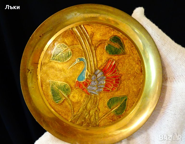 бронз,декорирана с пъстър паун сред зелени цветя,изобразени с цветен клетъчен