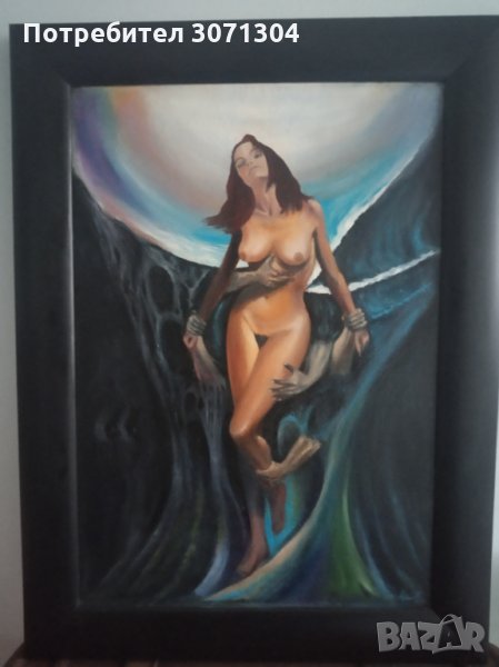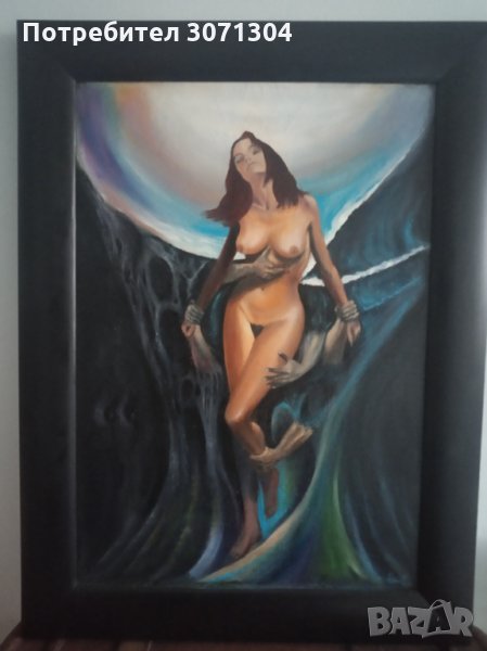 Маслени бои върху платно с рамката и подрамка размери височина 60см на ширина 45см на рамката от картина на Борис Валехо но в по приказен стил от автора.