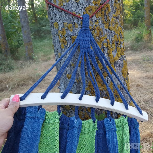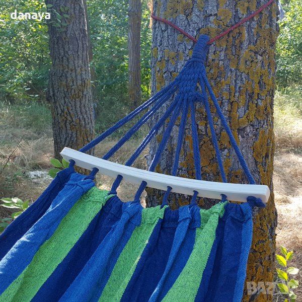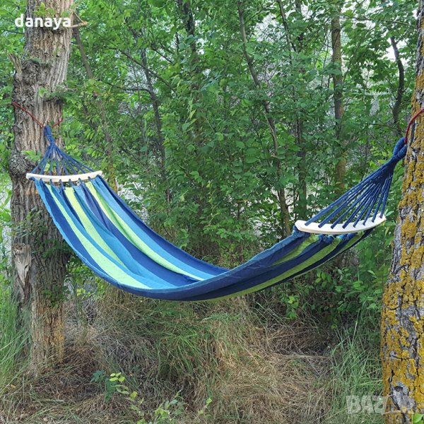 Градински хамак с извита дървена рамка. Нов хамак от плат за къмпинг или градина. Къмпинг хамаци изработени от здрав памучен плат хасе. Хасето е материя, която е мека и приятна на допир. Този градински хамак осигурява пълен комфорт по време на почивка сред природата. Поставянето на хамака е много лесно – закача се между две фиксирани точки. Пълна дължина 240см. Хамаците се предлагат с дървена къса извита рамка.