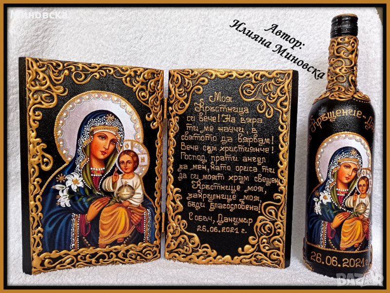 Книга, изработена от дърво с икона и послание, в комплект с бутилка.