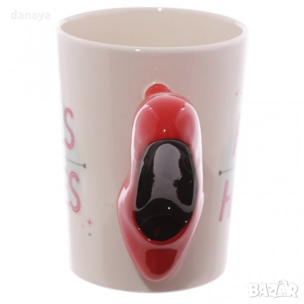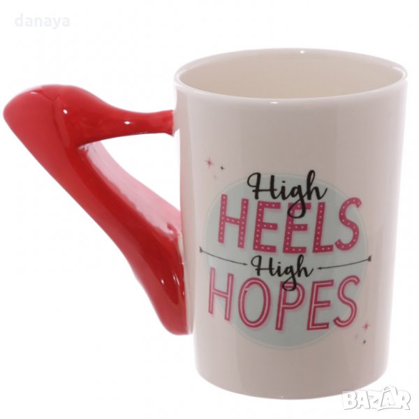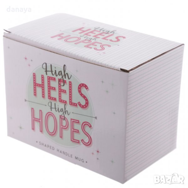 Забавна чаша за чай или други топли напитки в бял цвят с надпис послание “High Heels, High Hopes” – “Високи токчета големи надежди”. Дръжката с форма на червена дамска обувка с висок ток придружава посланието. Предлага се в тематична картонена кутийка. Чудесен подарък за нея.