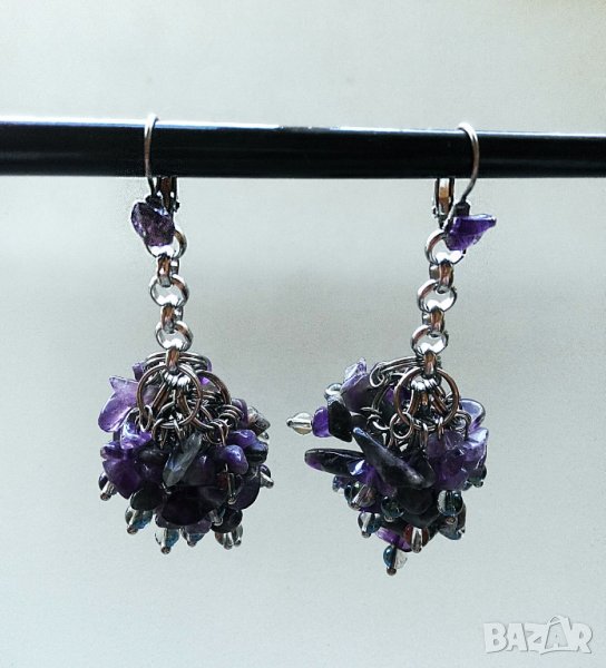 Висящите обеци са дълги 8 см, а обиколката на чепките аметист е ок. 10 см.Закопчаването е с лостче. Тежат 37.8 гр.