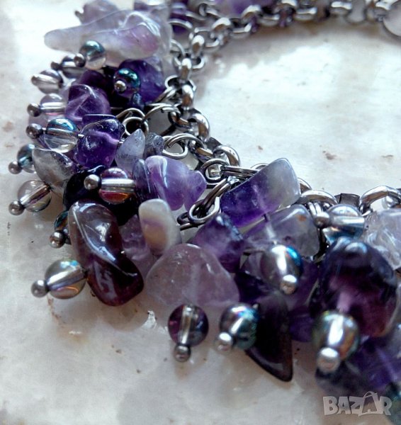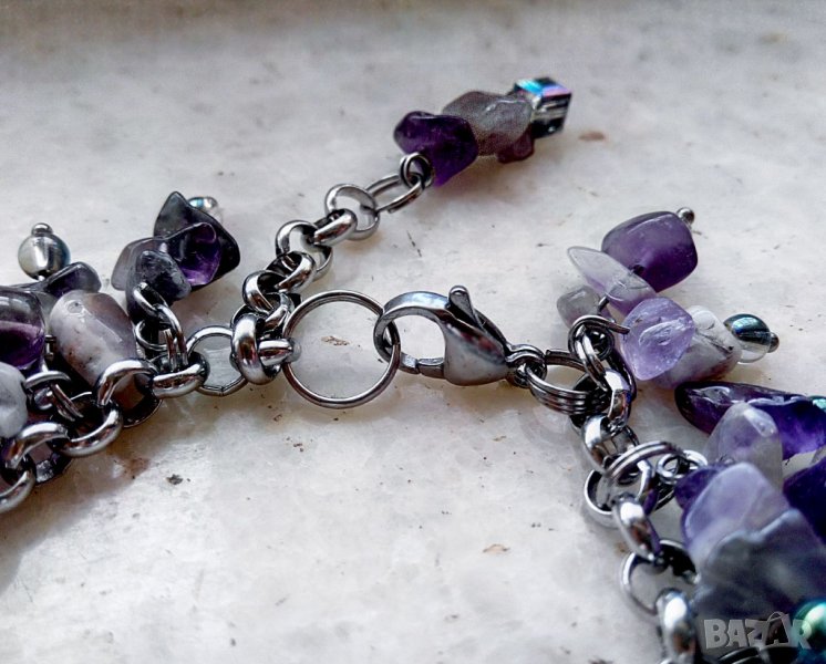 Мъниста тип чипс (4-10 мм) прикачени на верига "Роло" с акценти от 4 мм АВ кристални кръгли мъниста.. Абсолютно всички метални части са от неръждаема стомана.