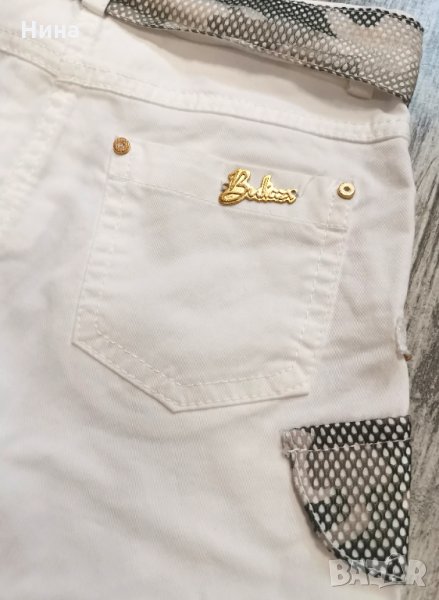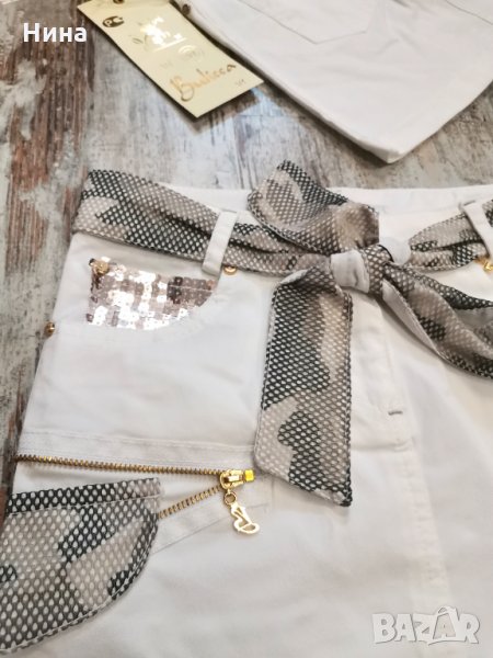 Страхотен модел пола от Bulicca, в бяло, със златисти ципове, обръщащи се пайети на джоба и колан в камуфлажен принт. Супер интересна и красива. За още моделчета разгледайте и останалите обяви в профила ми.