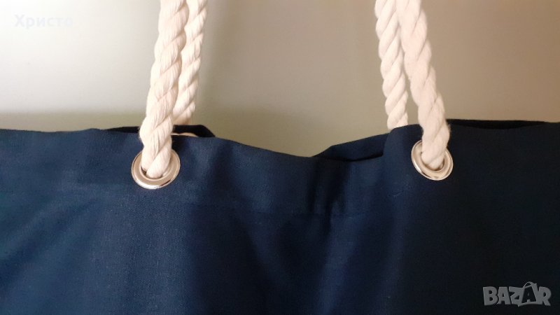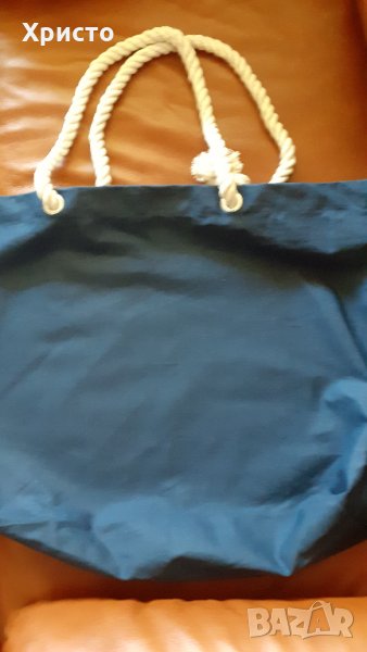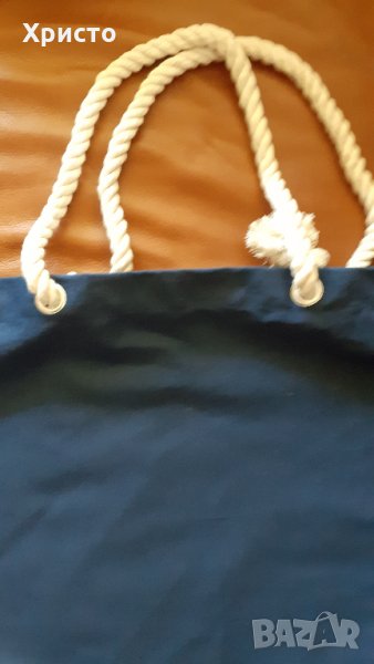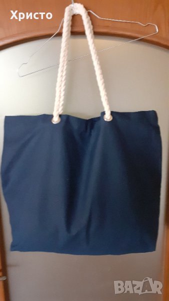 Продавам чанта за плаж и пазар, плътна и качествена, 100% тъмно син супер плътен памук. Размер 55х38 см, дъно 40х15 см. Дръжки дебели въжета от мек естествен памук с диаметър ф1,5 см, Надежда, стабилна и арт. Не е ползвана нито един път, подариха ми я тази година от Холандия.