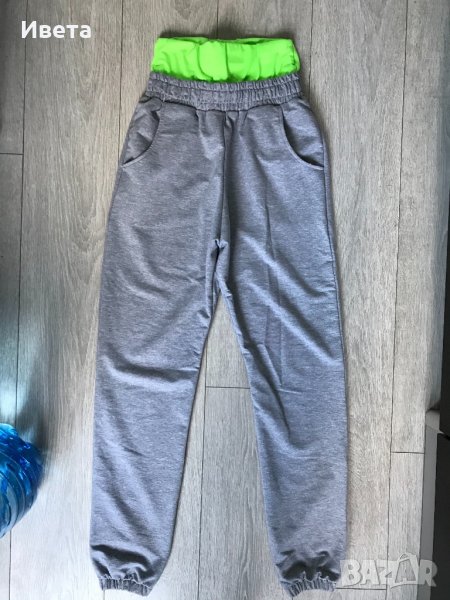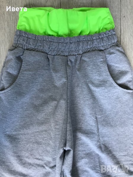 Дамско сиво спортно елегантно долнище със зелено електриково на кръста. Висока талия