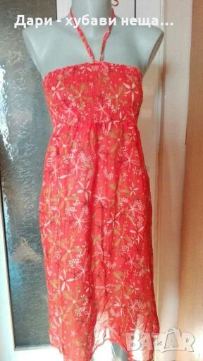 Нова, много лека материя - 100%памук.Подходяща е за плаж, или за ежедневието.Има прозрачност, но е пъстра и няма проблем да се носи така.Моделът е такъв, че може да се носи и като туника, или пола.Чисто нова е, но липсва хартиен етикет и цената е съобразена.