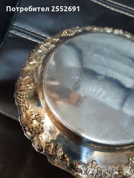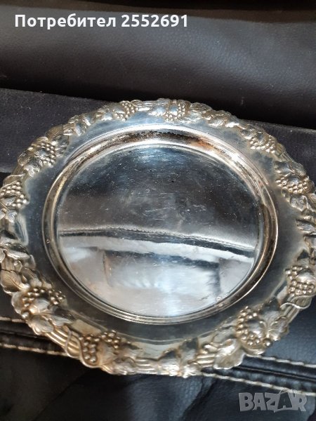 Красива ,метална, посребрена чиния , инкрустирана с флорални елементи . Наличие на фирмен знак. Диаметър-15,5см.