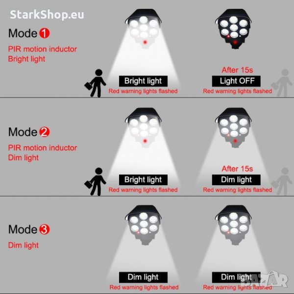 - РЕЖИМ 1: Когато засече движение светва ярко за 15 секунди и се изклюва